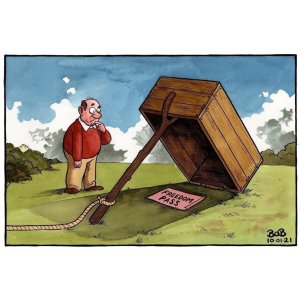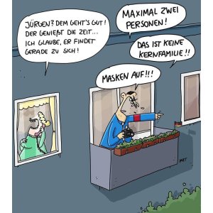 Trotz der ganzen harten Maßnahmen, dem als vermisst gemeldeten Grundgesetz, der zugrunde gerichteten Wirtschaft und den vielen traurigen Einzelschicksalen, darf man eines nicht aufgeben - den Humor. Zaubert er doch ein kleines Lächeln zumindest in die Gesichter derer, die sich nicht hinter der Maske verstecken...